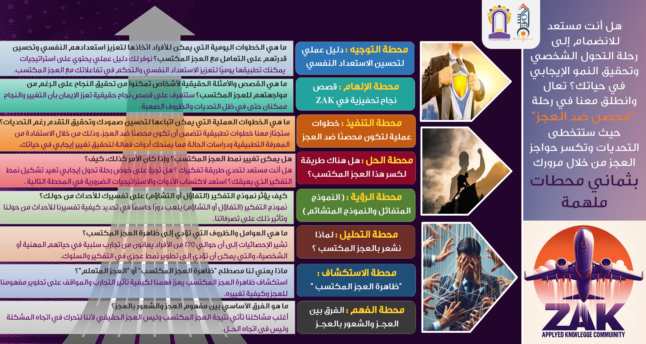 لأن المفاجأة أن العجز هو إحساس مكتسب زي الخوف مش بنتولد بيه وده معناه اننا نقدر يكون عندنا مناعة ضد الاحساس بالعجز لما هنفهم ازاي اقدر نواجه لما نحضر الكورس مع ZAK ACADEMY